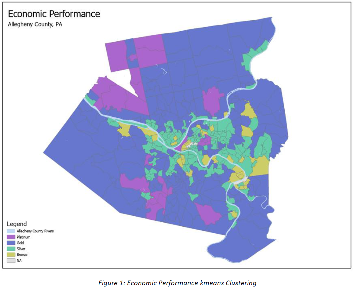 Image shows the kmeans cluster analysis results. The economic performance clusters are displayed below. The cluster used 10 variables: median household income, median sale price, variance sale price 2017 to 2019, % owner occupied homes, foreclosures, % poor condition homes, % homes with violations after inspection, new parcels created, vacancy rates, and subsidized homes. Figure 1 shows the cluster results by census tract.